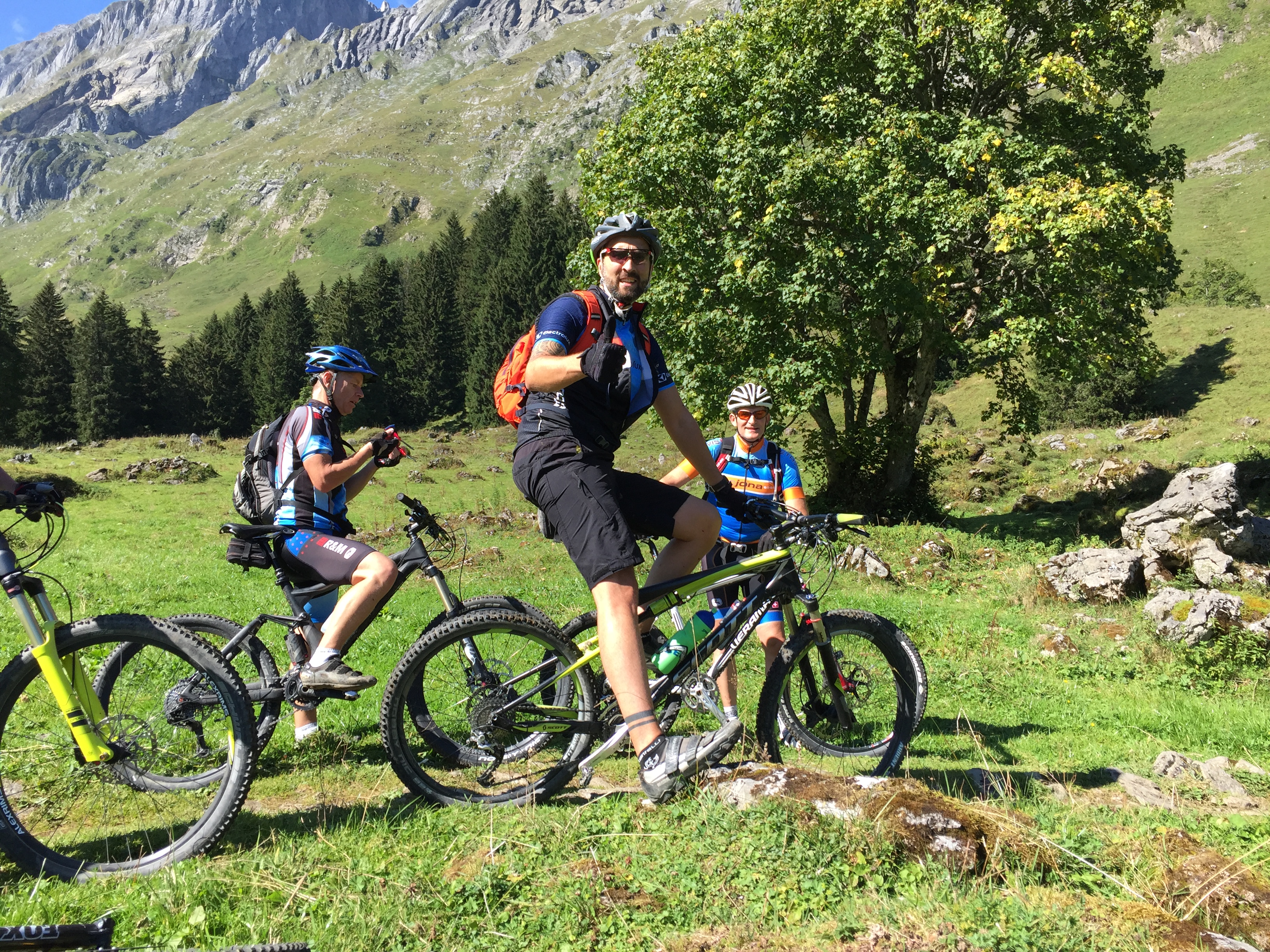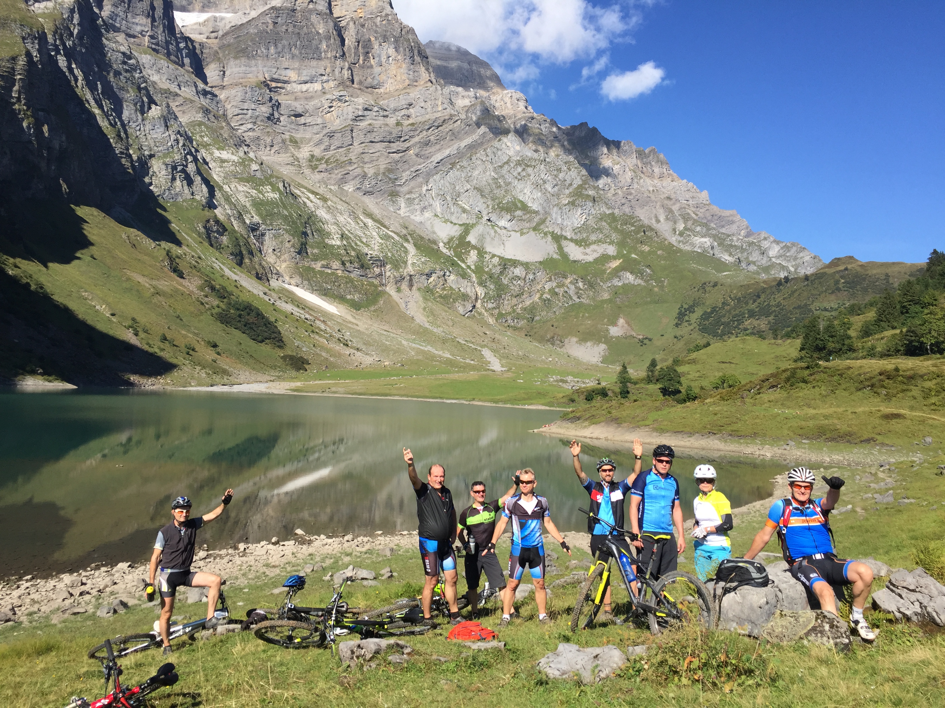 Nach dem Kaffee geht’s vor allem noch in eine Richtung...nach unten! Wir stechen über Singletrails hinunter ins Bächital. Bei der Bächialp entscheiden wir uns noch für einen Abstecher zum Oberblegisee. Hier wird’s dann auch wirklich knackig und nicht mehr alle Passagen sind fahrbar. Aber die Schiebestrecken haben sich gelohnt. Der klare, blaue Bergsee, inmitten der imposanten Bergen, mit seinen Geschichten ist wirklich ein Abstecher wert. Obwohl angekündigt...ins Wasser hat sich keiner gewagt! Nachdem wir uns von den drei Oberblegi-Enten verabschiedet haben setzen wir unsere Abfahrt fort. Nach drei Gegensteigungen und einem Alpabzugsstau mit einem wütenden Älpler geniessen wir auf Leuggelen noch ein wohlverdientes Adler-Pfiff.