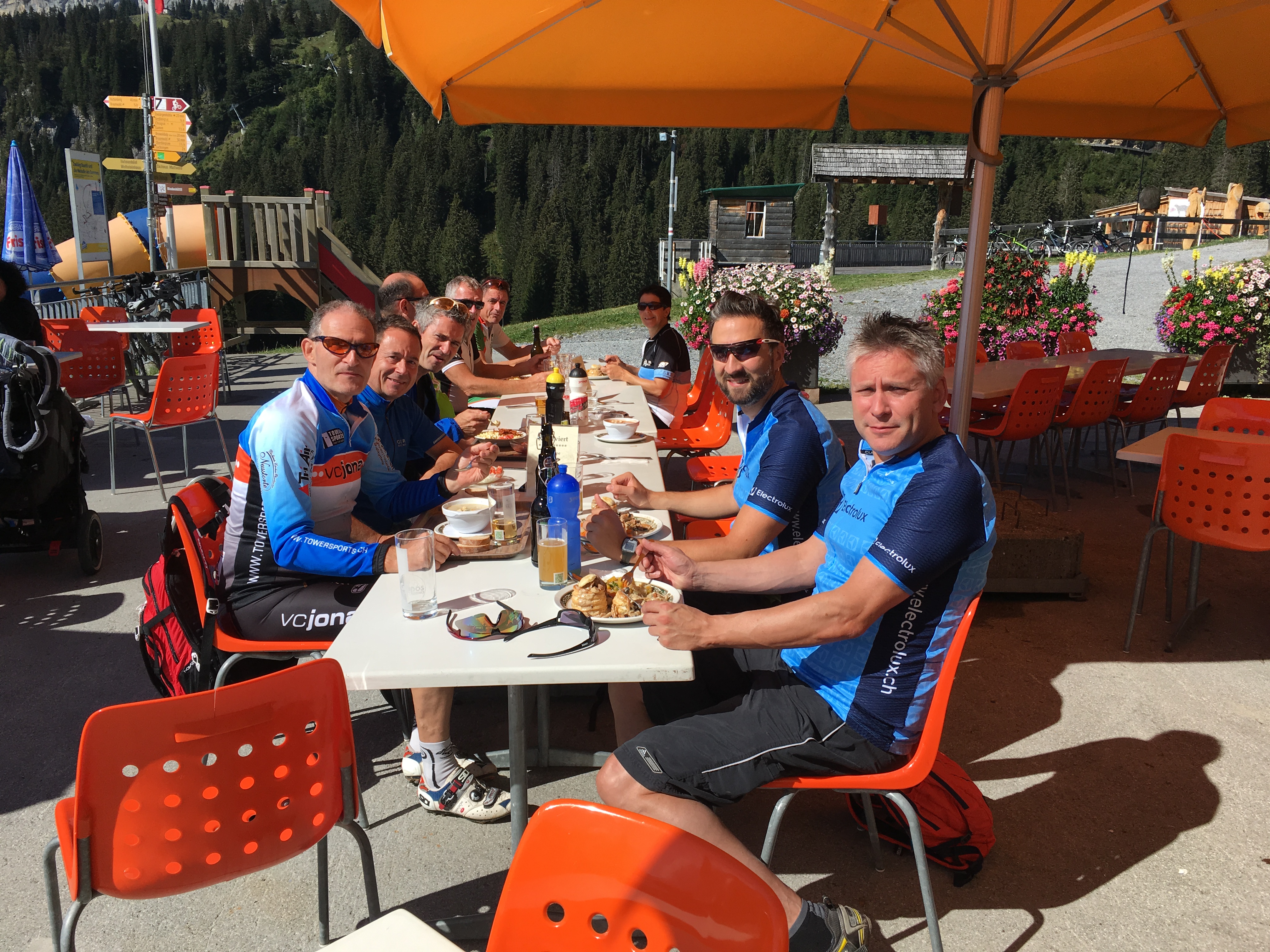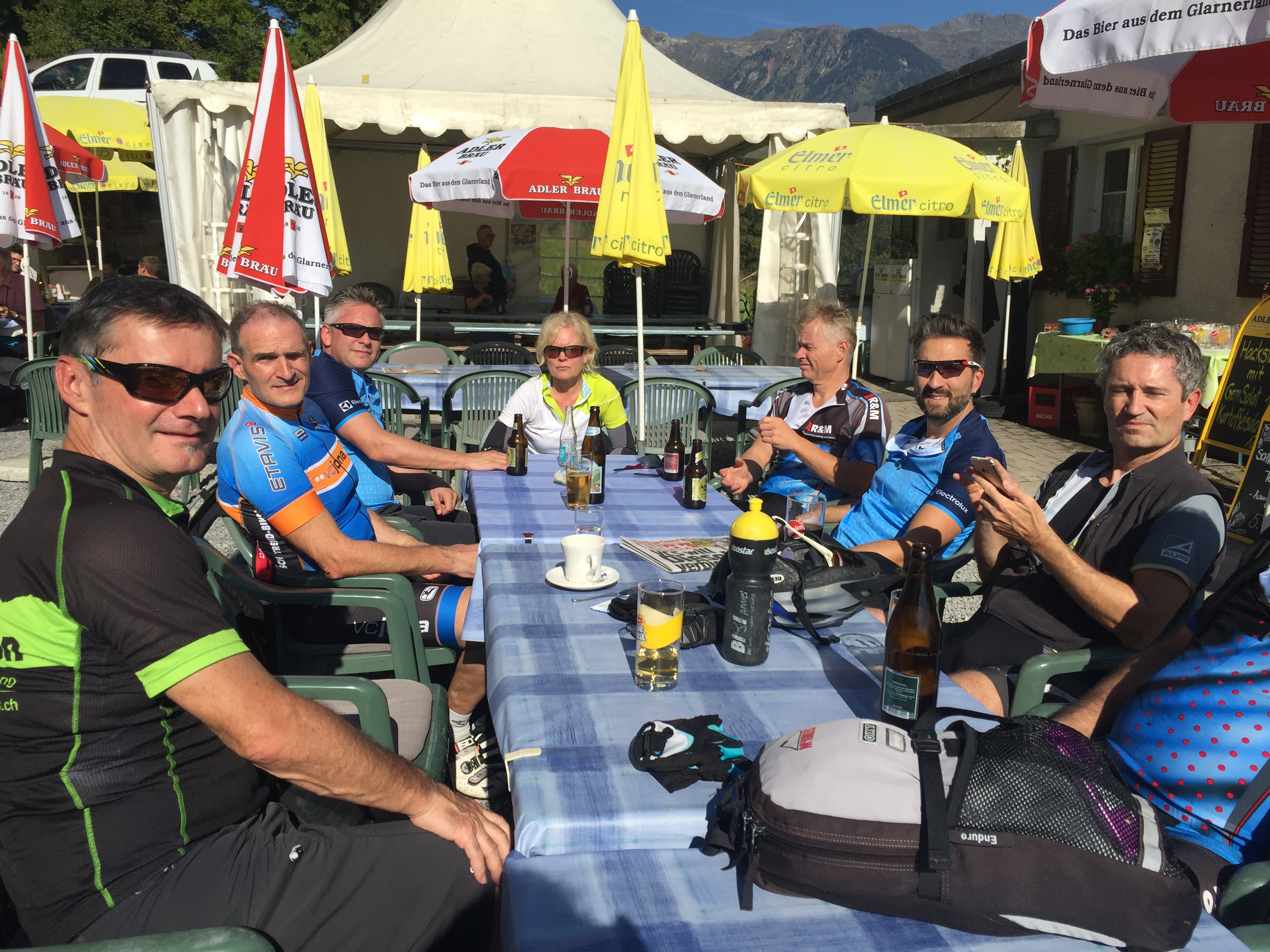 Sieben unentwegte Biker sind angereist, drei weitere gesellen sich noch während der Fahrt nach Linthal dazu. Die Schatten sind zu dieser Jahreszeit schon etwas länger als wir der Linth entlang das Glarnerland nach Linthal radeln. In Linthal angekommen steigen wir ins "Braunwaldbähnli" und überwinden die steile Rampe mühelos zum autofreien Kurort Braunwald. Weiter geht’s wieder mit eigener Kraft auf Fahrwegen durch Braunwald und anschliessend steil hinauf bis zum Restaurant Grotzenbühl. Bei strahlendem Sonnenschein geniessen wir die feinen Wildspezialitäten und natürlich den grandiosen Ausblick zum Tödimassiv. Interessante, spannende Gespräche über Gott und die Welt, (Glarner-) Land und Leute aber auch Business und Fun bereichern das gesellige Zusammensein.